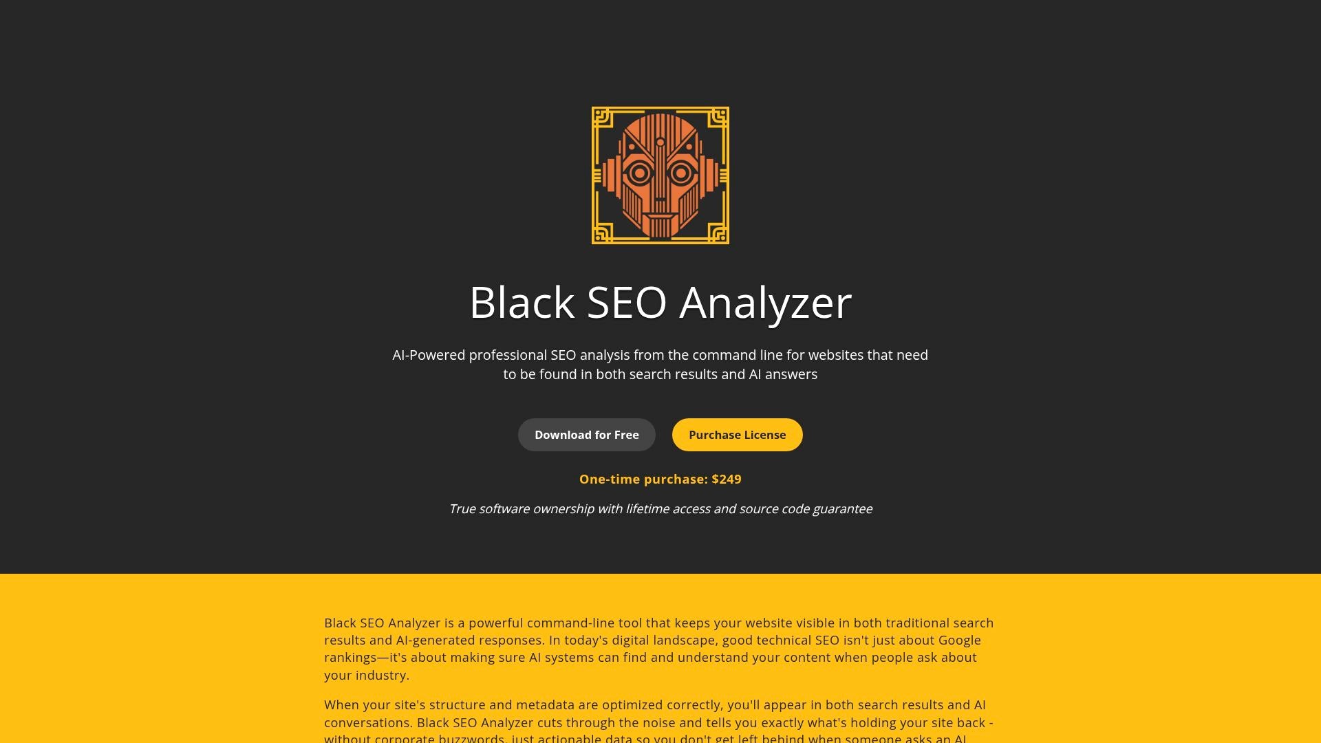 Black SEO Analyzer is a robust command-line tool designed to boost your website's visibility in both search engine results and AI responses. It offers comprehensive solutions for improving your site's online presence, making it an essential asset for SEO professionals.
