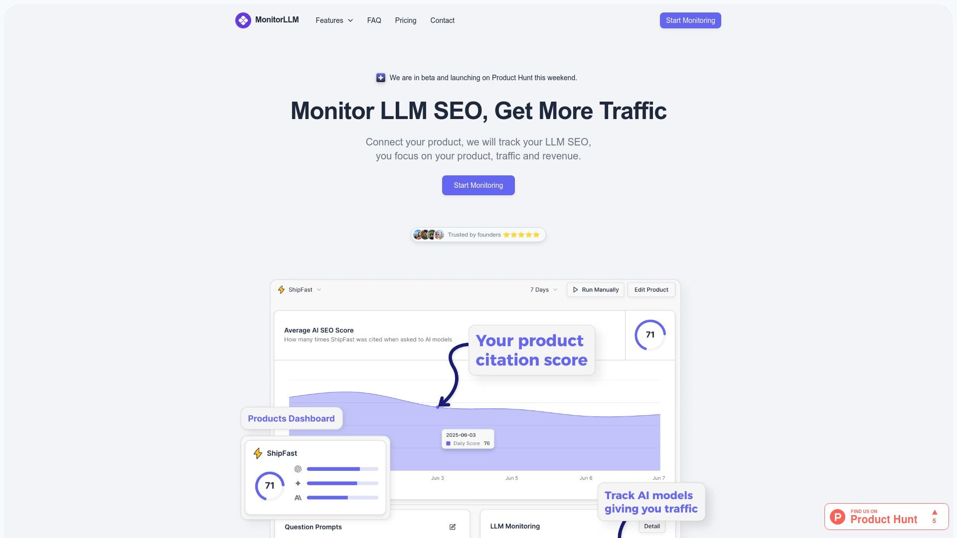 MonitorLLM ensures a straightforward setup, connecting directly with your product to begin tracking SEO metrics. Users can focus on their core business functions while the tool manages SEO data.