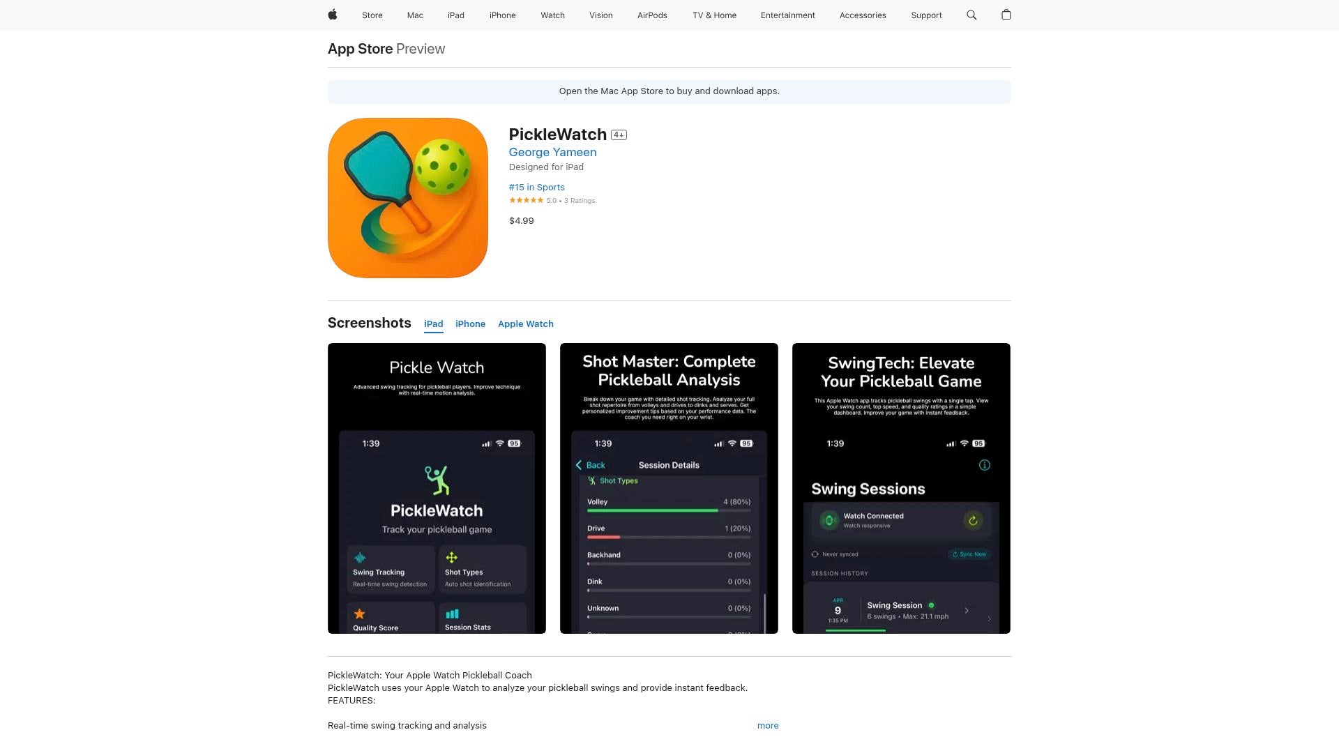 PickleWatch is your ultimate Apple Watch pickleball coach, offering real-time swing analysis and feedback. It enhances your game by providing detailed performance metrics and personalized tips. Perfect for players of all levels, PickleWatch helps you refine your technique without any additional equipment.