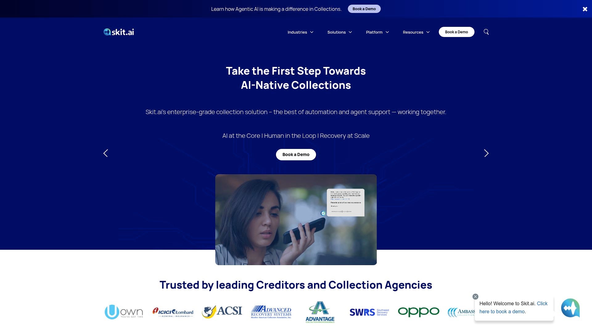 Skit.ai offers leading Conversational AI solutions for collections, integrating voice, SMS, email, and chat to enhance customer engagement and ensure compliance. Its platform automates collections, streamlines workflows, and optimizes agent productivity, adhering to regulations like TCPA, HIPAA, and more.